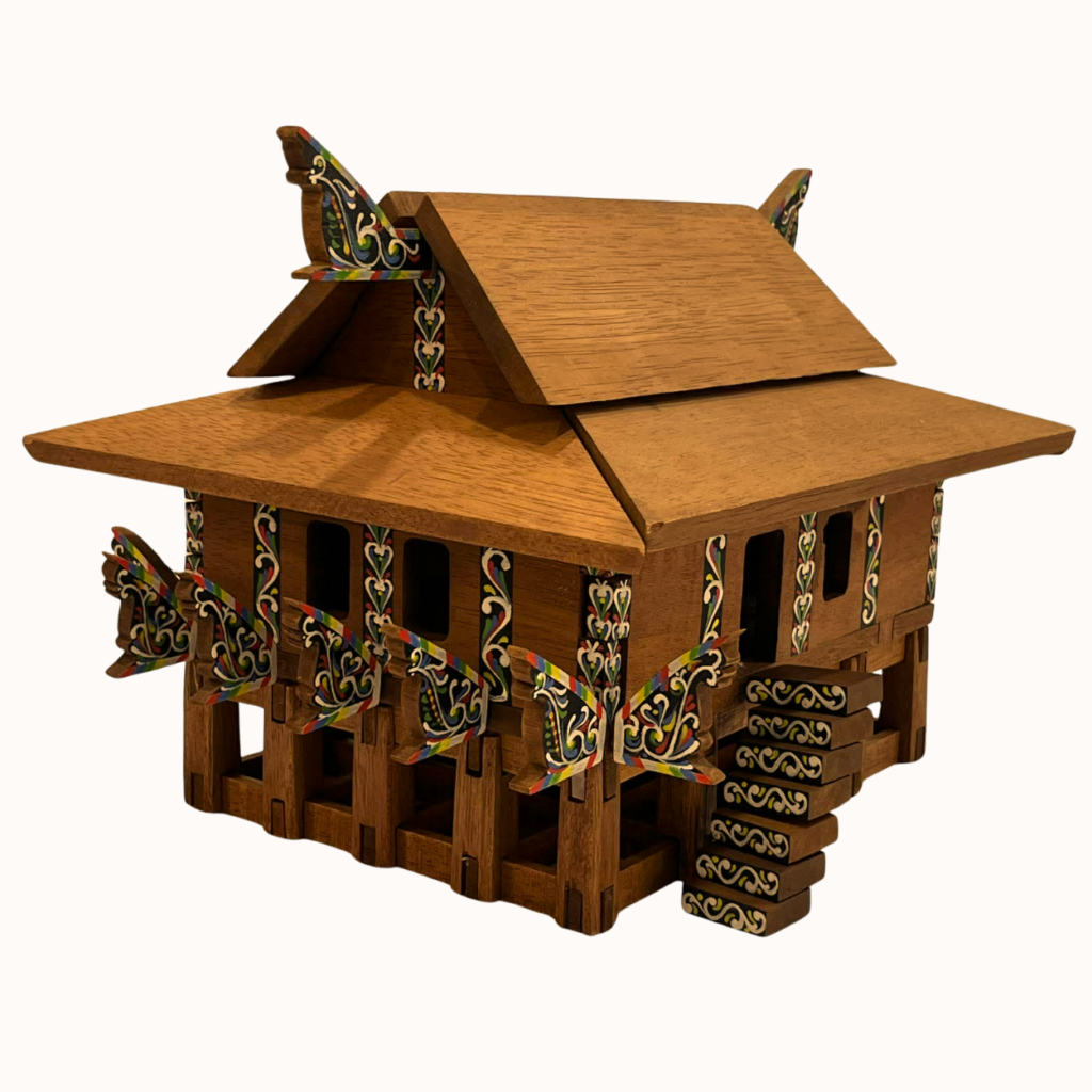 The product is a Handcrafted 3D buildable models inspired by Philippine architectural heritage. This edition is Torogan. The torogan is the ancestral royal house of the Maranao of Lanao del Sur, elevated on hardwood posts and crowned with carved panolong beams adorned in okir motifs. More than shelter, it embodied leadership, ceremony, and community life, expressing climate wisdom, craftsmanship, and cultural identity through structure, ornament, and spatial dignity. Click the image to order.